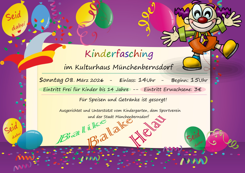 | Mitteilung | Kinderfasching im Kulturhaus am 08.03.2026 |
